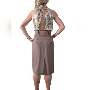 Elevate your look with this stunning vintage Caché Contour Collection silk blend dress, size 2. This halter neck midi dress features a bold keyhole front cutout with button closure, a figure-flattering bodycon pencil skirt silhouette, and an elegant open back detail. The top is designed with a colorful paisley-inspired abstract print in silk blend, perfectly contrasted with a high-waisted brown fitted skirt for a sophisticated, timeless look.