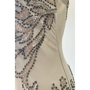 d e t a i l s : absolutely stunning champagne silk dress with original tags still attached, mesh mermaid hem, beaded trapunto stitching throughout, illusion bodice, would make a beautiful wedding gown