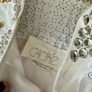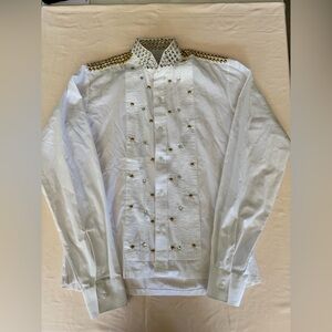 On trend western style tuxedo shirt bedazzled with rhinestones and gold nail heads. Small stain (untreated) on back as shown in photos. Size tag removed but fits as a size small