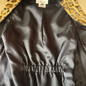 Vintage 1980 Cache faux fur lined vest. The leopard print is bold and saturated, with rich amber, caramel and black tones, closed with a full zip gold tone zipper. Cut is structured yet boxy, with a slightly cropped length, cinching subtly at the back waist. Lined in 100% luxe acetate.