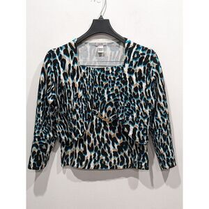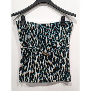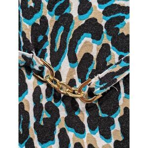 Unique animal print with a pop of teal blue in this sweater set. The strapless bandeau top with an attached faux gold link belt is paired with a matching cropped 3/4 sleeve open front cardigan. Both pieces are crafted from a super soft, lightweight viscose cotton blend knit. Tons of versatility. Wear these pieces together or separately to create the perfect look for any occasion.