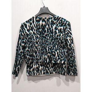 Unique animal print with a pop of teal blue in this sweater set. The strapless bandeau top with an attached faux gold link belt is paired with a matching cropped 3/4 sleeve open front cardigan. Both pieces are crafted from a super soft, lightweight viscose cotton blend knit. Tons of versatility. Wear these pieces together or separately to create the perfect look for any occasion.