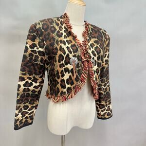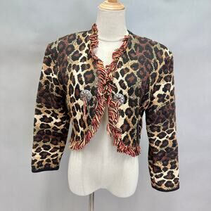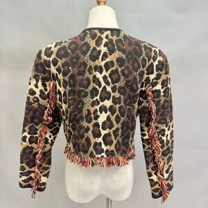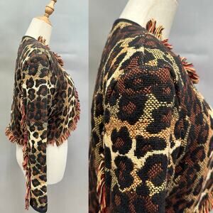 Vintage Cache Leopard Print Woven Fringe Bolero Blanket Jacket Size Small Cotton