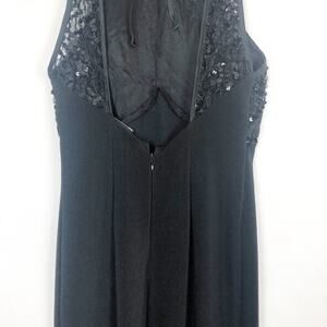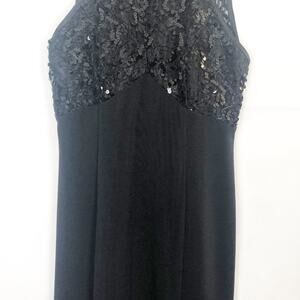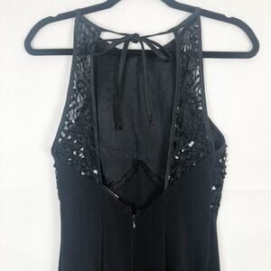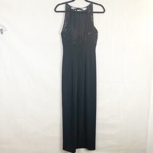 Cache women's vintage maxi dress. Round neck. Sleeveless. Lace/sequin. Cut out in back. Ties in back. Hidden zipper in back. Front slit. In very good used condition. No stains, tears or holes.