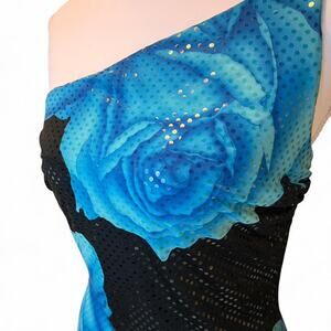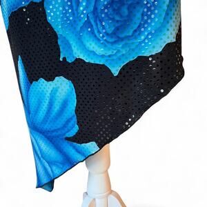 vintage cache dress, y2k evening dress, one shoulder dress, blue rose print, sequin dress, cocktail party outfit, prom dress, formal event dress, asymmetrical hem dress, night out outfit, wedding guest dress, bachelorette outfit, new year’s eve dress, holiday party look, glam retro style, made in usa, elegant fitted dress, floral pattern, slinky dress, retro eveningwear