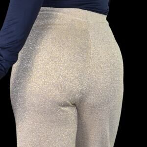 Vintage Cache pants FEATURE a shimmery gold metallic knit fabric. Wide straight pant legs. High waist. Pull on easy style.