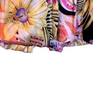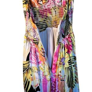 This Vintage Cache Mini dress is a captivating choice for a cocktail event, featuring a ruched halter neckline and a fitted bodice that elegantly flares into a playful bubble flounce hem skirt. The vibrant Pink and Gold Yellow hue adds a touch of sophistication, while the sleeveless design ensures comfort and style. Perfect for a night out, this backless sundress is both chic and eye-catching. 100% Silk. Lined Skirt. Size 4. EUC