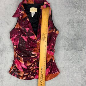 Absolutely gorgeous and vibrant sleeveless blouse by Cache. Features a collared neckline, ruched front detailing, and a striking allover abstract floral print in shades of pink, orange, and burgundy with transparent sequins paillettes that shine in the light. Made in the USA from a soft polyester-spandex blend for a comfortable stretch fit. Perfect retro statement piece for nights out, parties, or your throwback essentials 2000s closet.