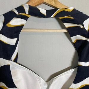 This vintage Cache Cache dress is a stunning piece that will make you stand out in any occasion. The black and white zebra print on a silky satin fabric gives it a bohemian and retro feel, perfect for a party or wedding. The dress features a sweetheart neckline, cap sleeves, and a high waist that flatters your figure. The dress is padded, ruched, and stretchy, providing a comfortable and flattering fit. It has a slimming effect and is lined for added quality. The dress is easy to care for, as it is dry clean only. This dress is a perfect addition to your wardrobe, whether you're going to a formal event or a night out with friends.