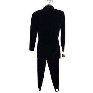 Cache Velvet/Velour Black Jacket over Black jumpsuit. Jacket has one button closure. Button is accented in gold with velvet/velour covering. Gold studded accents on collar.Long sleeve. Shoulder pads in jacket. Jump suit is sleeveless, cinched waist, with belt and buckle. Minimalist belt loops in back. Pants have loop at bottom, for slim fit into boots or shoes. Full length of jumpsuit from collar to bottom of pants is 50" Jacket across chest is 19" Jacket length 32" Belt length is 36" Sleeve length 22" This is a size M (medium) Please refer to measurements for fit. Made in USA Hand Wash Cotton Polyester Lyca blend This is a vintage item from my own closet. In very good condition, minimal wear. Classic Cache look.