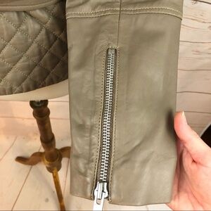 Cache Quilted Leather Motorcycle Jacket. Ruck Taupe Tan color. Detachable waist belt. In good condition but there is one tiny patch that was fixed on the arm. Not at all noticeable. Front zip, zippered cuffs. Size Medium.