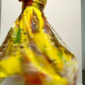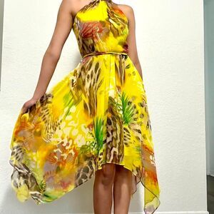 Vintage Cache dress in a vibrant multicolor print with gold accents. Stunning flowy silhouette with asymmetrical hemline and a bold halter neckline with gold chain detailing. Features a waist tie with gold beaded ends for a custom fit. Eye-catching and perfect for parties, vacations, or special occasions.