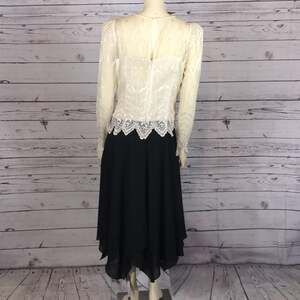 Beautiful long sleeved dress With cream embroidered lace bodices With built in camisole. Black asymmetrical chiffon like skirt, fully lined, this outfit is all one piece.