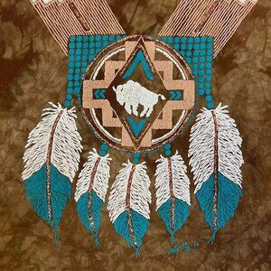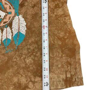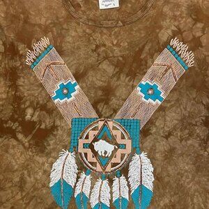 90s Vintage Brown Tie Dye 100% Cotton Tshirt by Lynee. This gorgeous Native American/American Indian styled Print from 1994 has Beautiful Blue and White Turquoise styled Feathered Necklace aesthetic with a Bison/Buffalo relief in the center of a dream catcher. With Glitter and Pearl accents. Made in the USA in Like New Vintage Condition. *2 small holes from tags in back by clothing label. See last pic.
