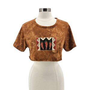 Short sleeve cropped t-shirt crop top - shade of tan / light brown with a tie dye design. Puffy print graphics on the front of red chili peppers & has hints of silver metallic glitter graphic print. 100% Cotton. Made in USA. Western wear, southwestern, vintage, retro, 2000's, 2000s, Y2K, hipster, festival, concerts, hippie, boho, bohemian, Lynee 2002.