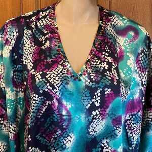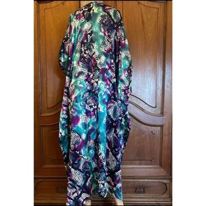 Vintage Caftan Sante' Classics Maxi Dress Aqua, Navy, Purple Print with Beaded Neckline One Size