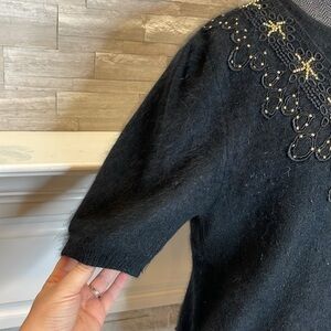 Vintage Calavini 70s Black Angora Sweater Short Sleeve Beaded Venetian Lace M