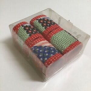 NEW IN BOX - Really cute SET OF 4 quilted napkin rings with red and white polka dot border trim. Each ring measures approximately 2” wide and 2 1/4” long.