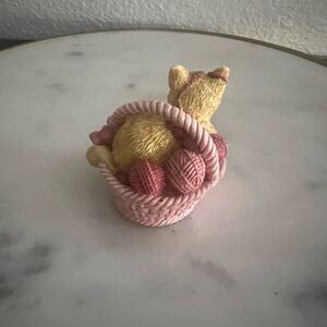 The Vintage Calico Kittens Priscilla Hillman 1997 Russ & Bernie Co. Kitty with Yarn is a charming figurine from the Calico Kittens collection. Crafted by Hillman in 1997, this adorable kitty cat is a decorative collectible that captures the essence of nostalgia and whimsy. Perfect for cat lovers and collectors alike, this piece adds a touch of vintage charm to any space with its intricate details and playful design.