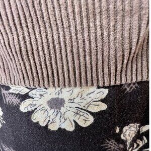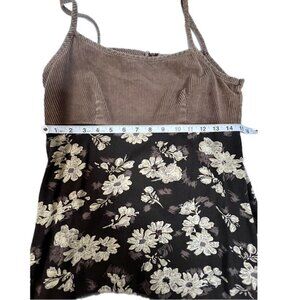The top half is corduroy and the bottom flaunts a girly flowery pattern. It has a back zip closure.