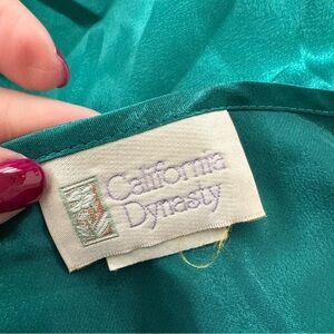 Vintage 90's California Dynasty Emerald satin slip dress with black lace accents.