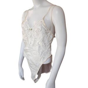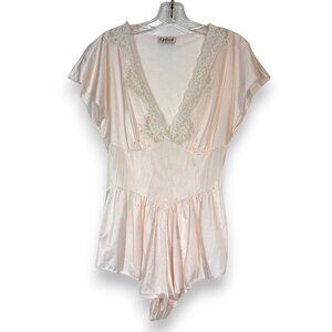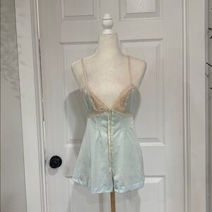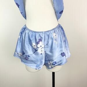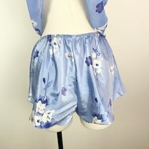 1980s two piece set from California Dynasty. Vintage. Semi sheer blue floral with lace trim and rose on top and satin elasticized waist shorts.