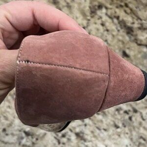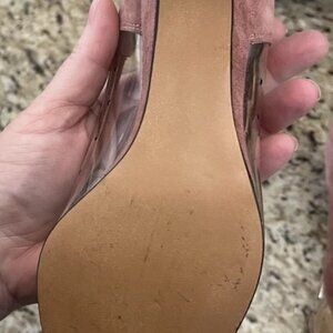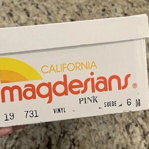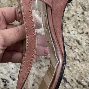 Stand out with these rare vintage California Magdesians women’s heels, made in the USA. These shoes combine clear vinyl sides with rose pink suede trim for a striking, fashion-forward design. The peep toe style, perforated details, and low wedge heel give them a retro edge while still being versatile enough for dress or casual wear.