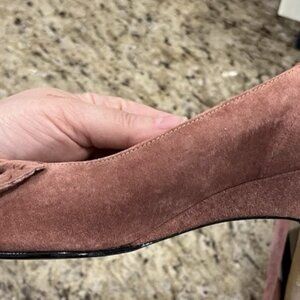 Show off timeless vintage style with these California Magdesians women’s wedge heels, made in the USA. Crafted from soft rose suede, these slip-on shoes feature a classic peep toe design, perforated bow detail, and a comfortable low wedge heel. Perfect for adding a retro touch to dressy or casual looks.