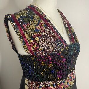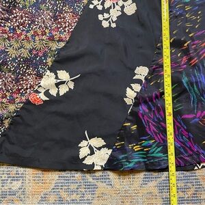 beachy, flowy, vacation, beach, costal, midi dress, flowers, floral, colorful, unique, silky, satin, ruching, printed, boho, 70s, 80s, 90s, vtg, patchwork, hippie, casual,