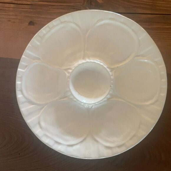 In the heart of mid-century California, these white oyster plates were crafted with care, displaying a timeless design. Perfectly molded for oysters, their smooth, glossy finish reflects a bygone era of elegance and culinary delight. A testament to superb craftsmanship, these plates capture the essence of vintage California dining. Indistinuishable from the French made oyster plates of similar vintage. A second set of two plates is also available for purchase.