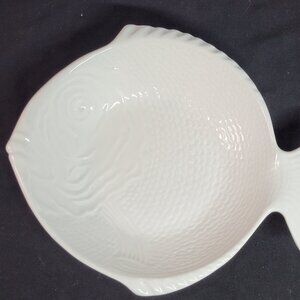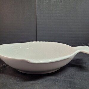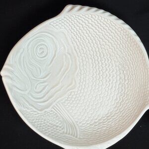 This Vintage California Pottery 588 Fish Bowl Dish Platter is a charming and unique piece that adds a touch of nautical, ocean, and tropical style to any table setting. Made of white ceramic with a glossy finish, this serving bowl features a fish-themed design and is perfect for all occasions. The mid-century modern style and art pottery production technique make it a standout piece that will impress guests and elevate your dining experience. Made in the United States by California Pottery, this vintage bowl is a one-of-a-kind collectible that is sure to be a conversation starter.