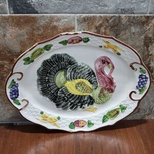 Vintage California Pottery Turkey Thanksgiving Serving Platter Oval Hand Painted Embossed Turkey Fruits Vegetables Around Rim
