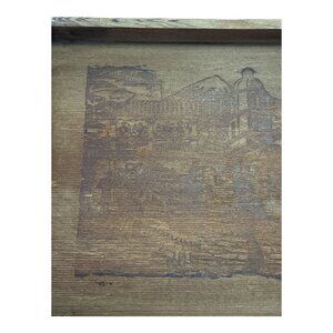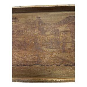 Crafted from genuine California redwood, this vintage souvenir tray features an etched scenic village design with mountains, domed buildings, and townspeople. Likely made between the 1940s and 1960s, it captures the rustic charm of mid-century West Coast tourism.
