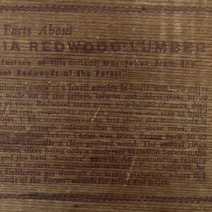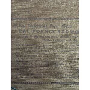 The back includes a detailed paragraph titled *"A Few Interesting Facts About California Redwood Lumber,"* highlighting the exceptional qualities of redwood, including its age, height (up to 350 feet), wide trunks (up to 26 feet), and natural resistance to decay. These trays were popular souvenirs during postwar travel booms and were typically sold in California gift shops and parks.