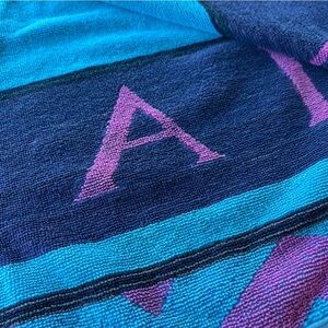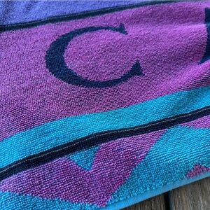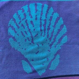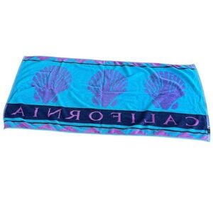 Vintage California Seashell Retro Beach Towel. Tagged USCA . Pink and Blue with a retro geometric design and large seashells, California spell out across the bottom. Soft top side, cotton terry under side.