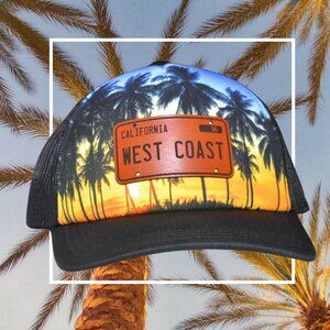 Laid-back vibes of the West Coast with this stylish Photo Real Snapback Trucker Cap. Featuring a unique custom leather patch that replicates a 1956 California license plate, this hat is a true standout piece. The vibrant sunset and palm tree print on the front panel adds a touch of California dreamin’ to your outfit.
