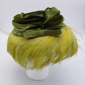 Vintage Calot Style Hat in Stunning Green and Citron Velvet & Feathers H…
