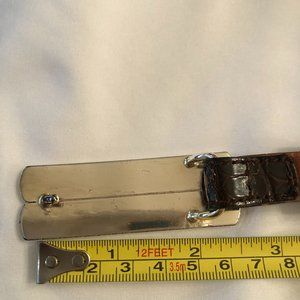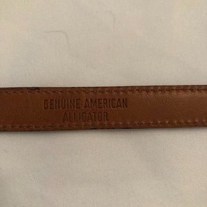 Calvin Klein Genuine American Alligator - Made in Italy. The color is a medium to darkish brown. This was never worn. I formerly Worked at Calvin Klein. All my products are genuine article. Belt is a size Women's size L. I have included pictures of tape measurements to make sure it fits. There are is chipping on the electroplated buckle shown in the picture. The belt is 5/8" wide. Lastly there is an image showing colors for contrast of different belts I have listed.