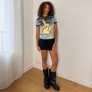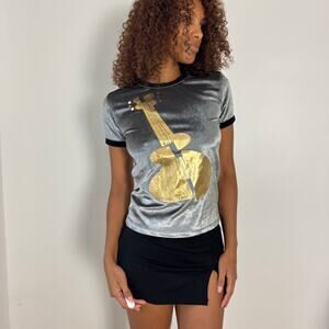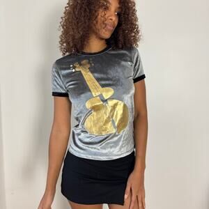Silver-grey velour short-sleeve tee with metallic gold guitar placement graphic and contrast black ringer trims; soft stretch and an easy, body-skimming fit. Hand sourced in Europe.