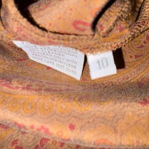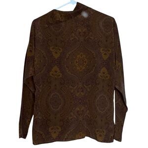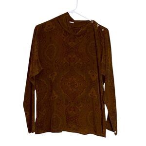 Elevate your vintage wardrobe with this stunning Calvin Klein blouse in a luxurious 100% silk fabric. This long sleeve top features a rich paisley pattern in warm tones of gold, rust, and burgundy—perfect for fall layering or statement styling year-round.