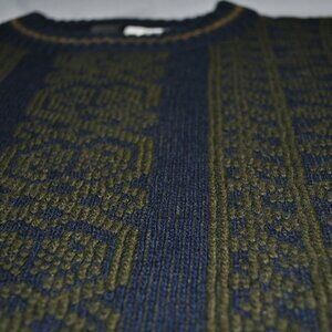 vintage sweater, crew neck, Cambio Italia, made in Italy, London Fog, pullover sweater, wool blend, acrylic, blue, green, burgundy, yellow, tan, geometric, abstract, geometric, funky, retro, 80s 1980s, 90s 1990s, knitted, dad sweater, streetwear, dadcore, grandpa sweater, grandpacore, preppy, unique, textured, Coogi like sweater, Missoni, Pendleton, 80s clothing, 90s clothing, dapper, dressy, casual, holiday, party, bold, warm, ski, snow, winter, fall, spring, autumn, designer, spots, patchwork, multi-pattern, new wave, academia, dark academia, goth, punk, indie, abstract