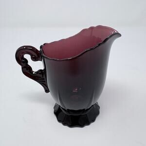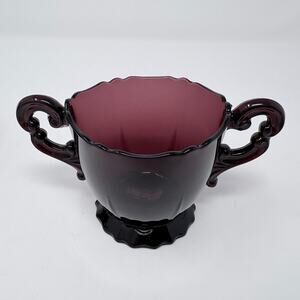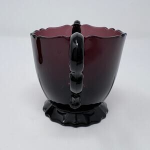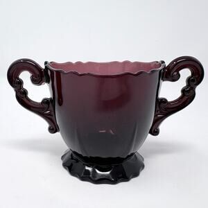 This is vintage Cambridge Glass creamer and sugar set made of amethyst glass with a glossy finish. It is footed and features a beautiful purple color. This original set was produced in the United States and is a collectible piece for those who appreciate decorative cookware and dinnerware.