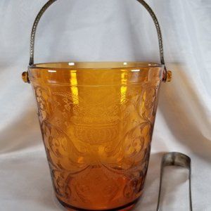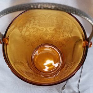 Vintage Cambridge Amber Urn Etch 710 Glass Ice Bucket is 5 7/8" tall (excluding handle) x 5 1/2" wide at top. It has a beautiful etched urn with flowers and scrolls all over. It has a hammered, metal bail handle and matching tongs. It is a beautiful piece in great condition. No chips, cracks or repairs. Please view pictures and feel free to ask questions. Thank you for visiting my closet.