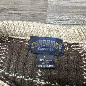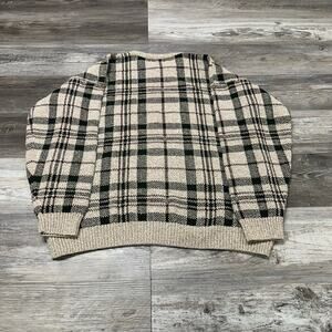 Vintage Cambridge Classic Flannel Tartan Plaid Cream Brown Green Mens XL Cable Knit USA Made Sweater