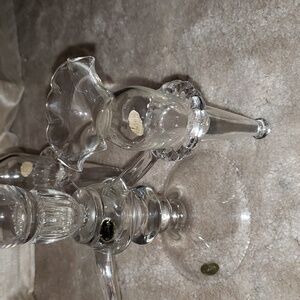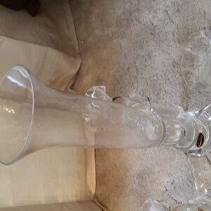 This is a great Vintage Cambridge Elegant Glass Epergne Candelabra. The base is 3 Arm and comes with a double Bud Vase Attachment and the Bud Vases. A great convertible centerpiece! The rubber insert for the bud vase attachment is too small so the attachment wobbles and isn't secure (replacements are available online).