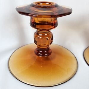 Elegant amber glass candle holders perfect for adding a warm touch to your home decor. Pre-owned. Tiny chip on bottom edge, otherwise in Excellent Condition