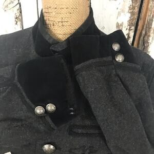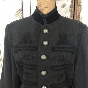 Military style grey wool short coat with black embroidery and detailing with velvet accents at collar and cuffs. Soooo gorgeous. Vintage!!! My mom owned this for 20+ years but I just don’t reach for it from my own closet. Size 10.