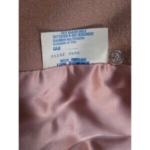This elegant vintage wool coat provides warmth and style with its double-breasted design, camel color, and soft pink satin lining. Ideal for colder seasons.
