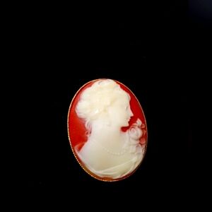 This beautiful vintage brooch features a beautiful lady with a floral corsage and pearl necklace. It is made of resin, not a carved shell, and is framed in a simplistic gold tone backing.