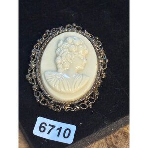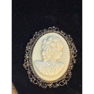 This vintage cameo brooch features a detailed silhouette of a woman's profile. The ornate metal frame adds a classic touch to any attire.